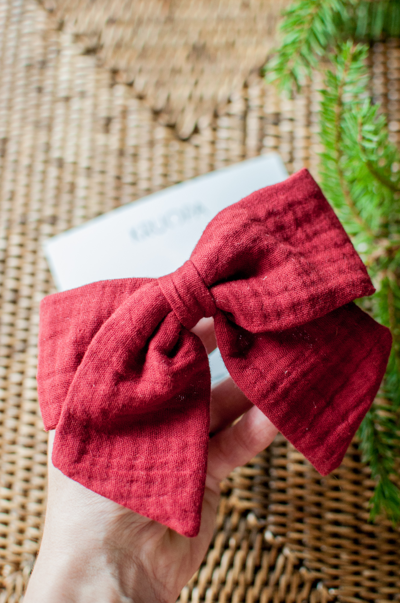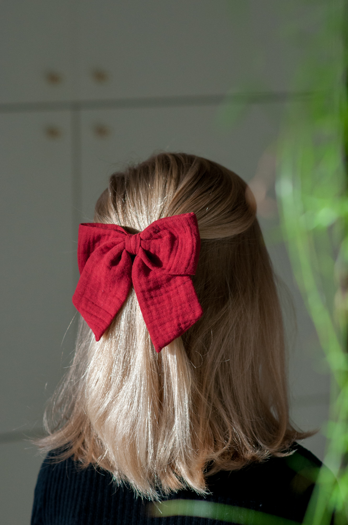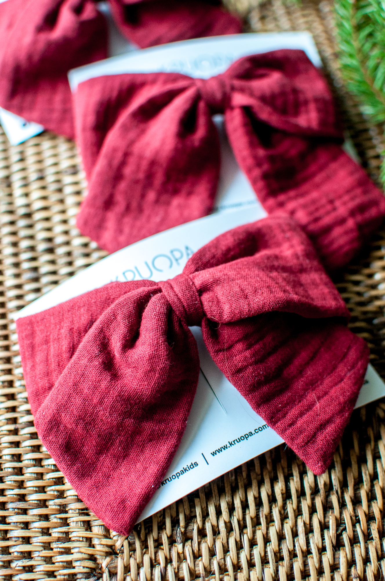 Ryškiai raudonos spalvos muslino kaspinas. Puikiai tiks tiek šventiniam laikotarpiui tiek kasdieniniam dėvėjimui. Sukurtas mergaitėms, bet puikiai tiks ir moterims.